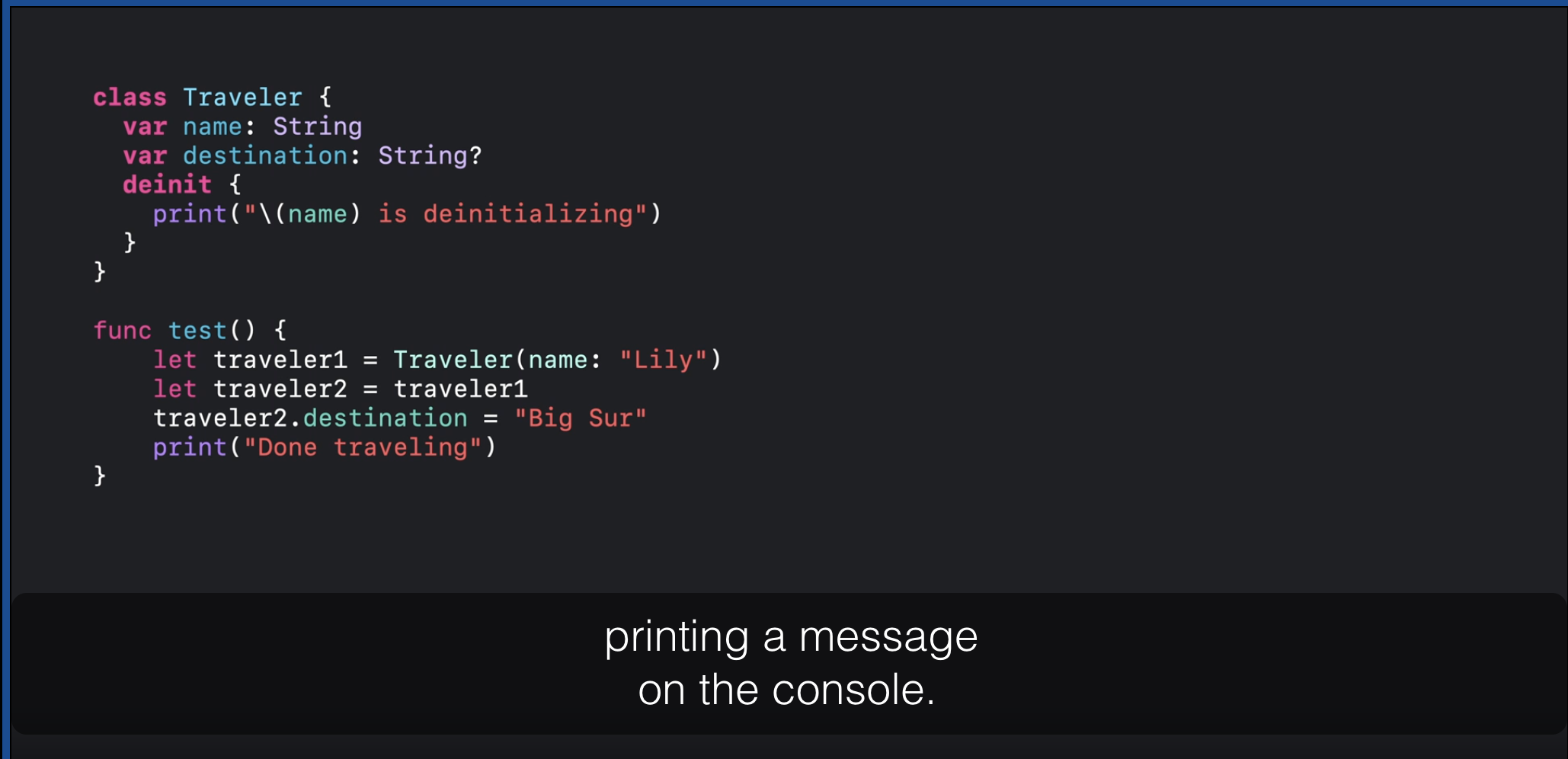 ํ์ฌ์ deinitializer๋ “Done traveling”์ถ๋ ฅ ํ ์คํ๋์ง๋ง ARC ์ต์ ํ์ ๋ฐ๋ผ destination์ด release๋ ํ deinit๋๋ค.