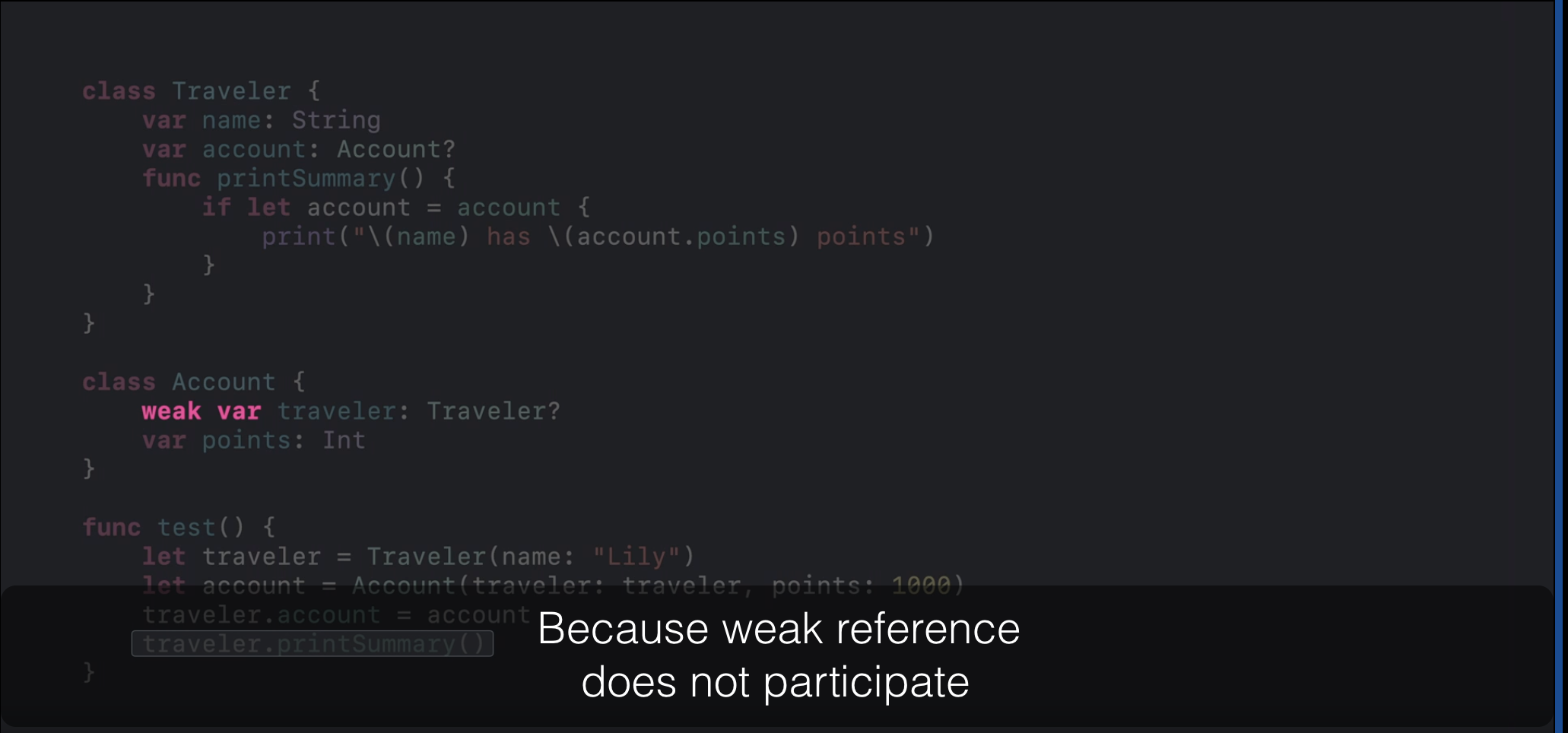 weak๋ก ์ ์ธ์ account๊ฐ์ฒด๊ฐ ์์ฑ์ traveler์ ref_count๊ฐ ์ฆ๊ฐ๋์ง ์์ผ๋ฏ๋ก account.printSummary() ์คํ ํ 0์ด ๋์ด dealloc๋ ์ ์๋ค.