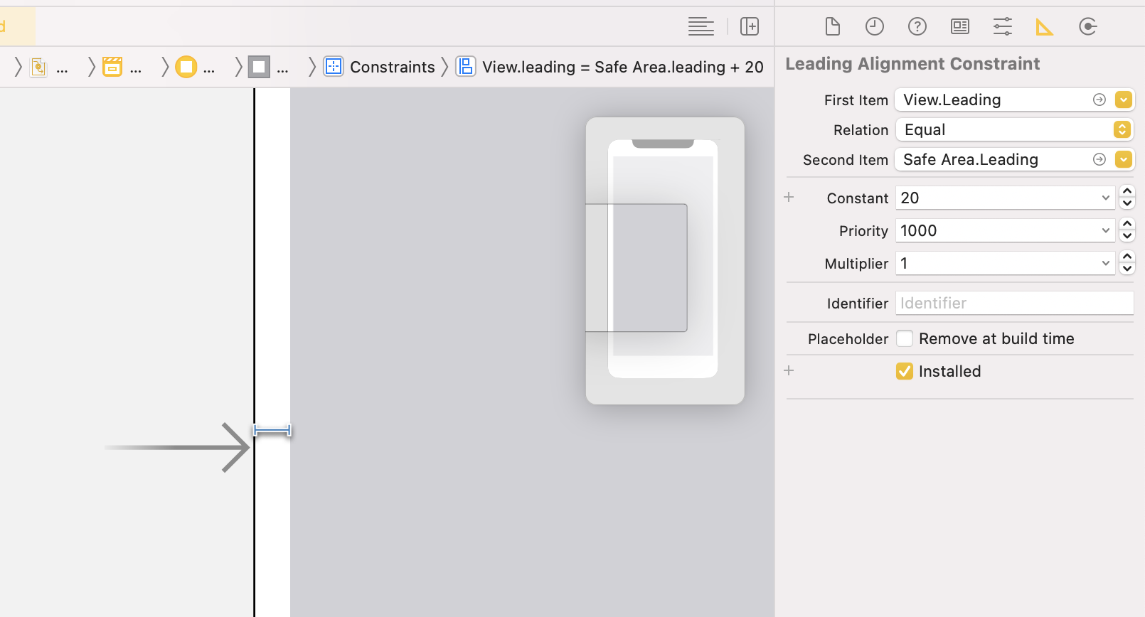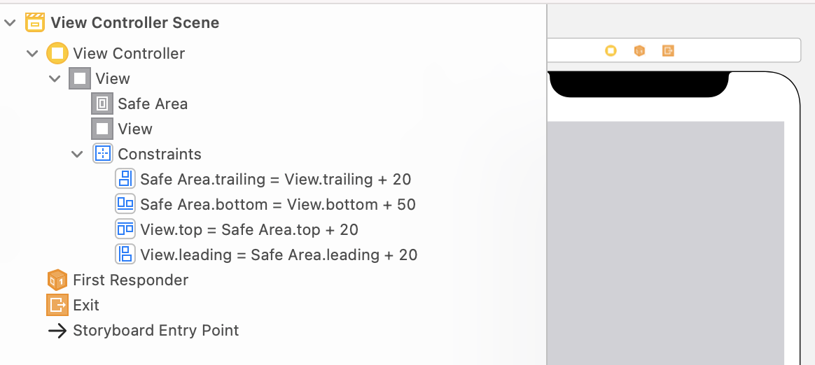 그리고 safeArea와 view사이 관계를 "같게", "더 작게", "더 크게" 만들 수 있는데 후행 constraint의 글자 길이를 모를때 사용하면 유용!